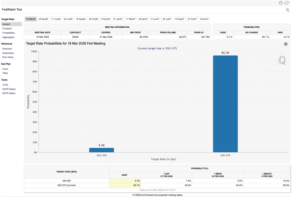 Согласно инструменту FedWatch от CME Group, вероятность того, что Федеральная резервная система сохранит процентные ставки без изменений в этом месяце, равна 95,7%. Отсутствие изменений может негативно сказаться на состоянии криптовалютного рынка.